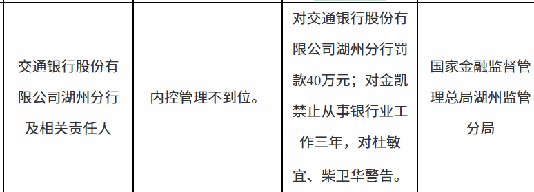 1月8日,国家金融监督管理总局湖州监管分局行政处罚信息公开表显示今裕堂,交通银行股份有限公司湖州分行因内控管理不到位被罚款40万元。责任人金某被禁止从事银行业工作三年,杜某宜、柴某华被警告。